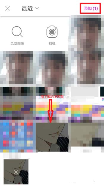 8、点击后系统会打开手机相册,找到我们刚才下载的动漫图片并选择,选择好后点击右上角的【添加】。
