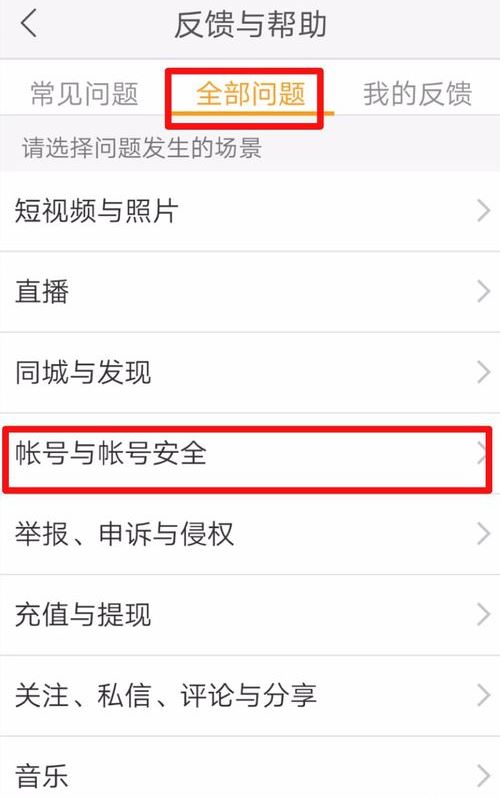 接着进入反馈与帮助页面,点击【全部问题】,再点击【账号与账号安全】。