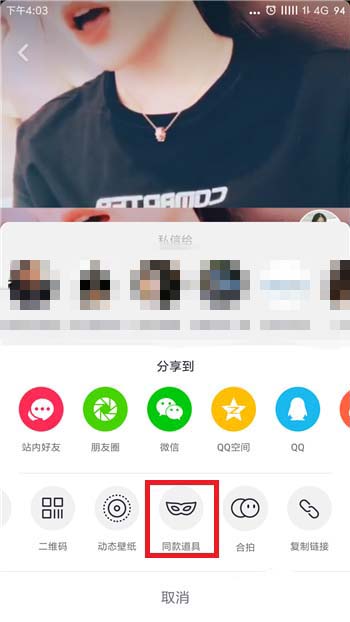 2、在转发按钮中找到【同款道具】选项,这个视频必须使用了道具才有这个选项。
