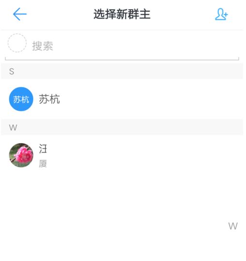 点击转让群主,进入到选择新群主界面,如图,