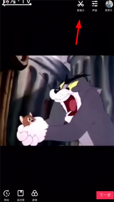 2、然后从视频编辑页面里选择右上角的按钮来添加配乐,配音添加完成后,就可以选择“剪音乐”功能进行剪辑了。