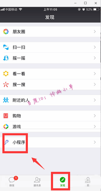 1、打开手机微信,点击“发现”,跟着进一步选择“小程序”。