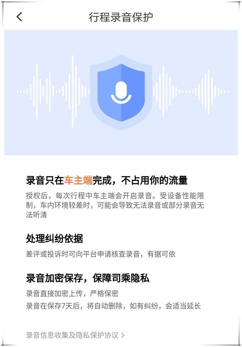 滴滴行程录音,只在车主端完成!也就是说,只有车主端的滴滴APP,才会在行程开始后开始进行录音,所以给滴滴录音授权也只需在车主端进行就可以了,用户端无须进行录音授权。