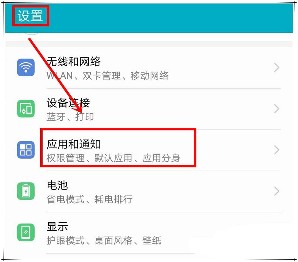 3、在手机桌面上,点击“设置”选项,打开设置页面,在该页面中找到“应用和通知”(不同系统的手机,选项、路径可能会有所不同)。