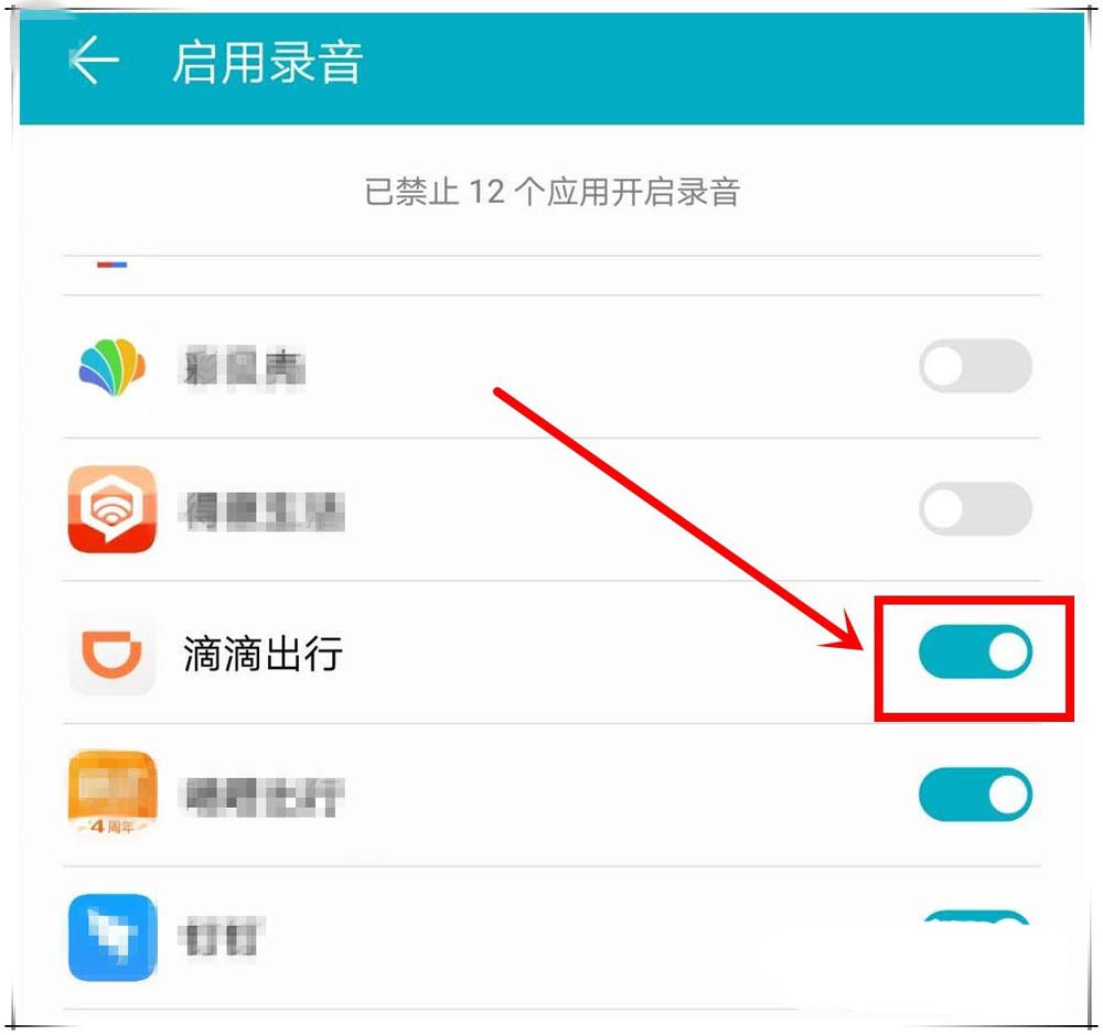 6、在“启用录音”设置页面,找到“滴滴出行”,点击后面的按钮,打开开关。这样,滴滴录音就授权成功了。