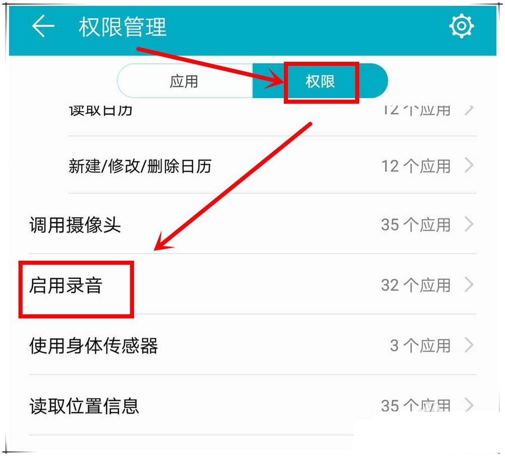 5、在“权限管理”页面,点击“权限”按钮,切换到“权限”页面,在该页面找到“启用录音”,点击进入下一步操作。