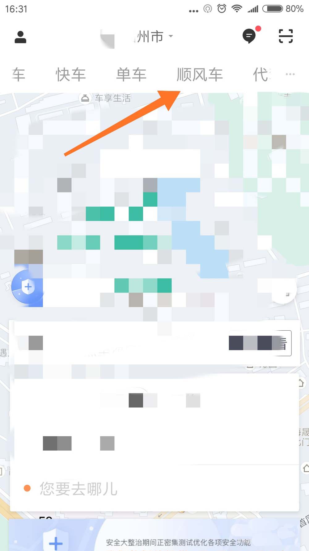 3、然后用手指滑动主页面上方的叫车方式,出行【顺风车】这个按钮之后,点击之。