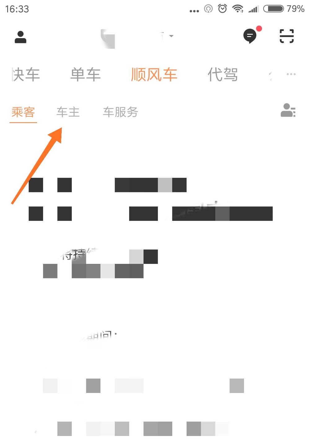 4、进入【顺风车】主页面之后,点击【车主】这个按钮,如下图所示。