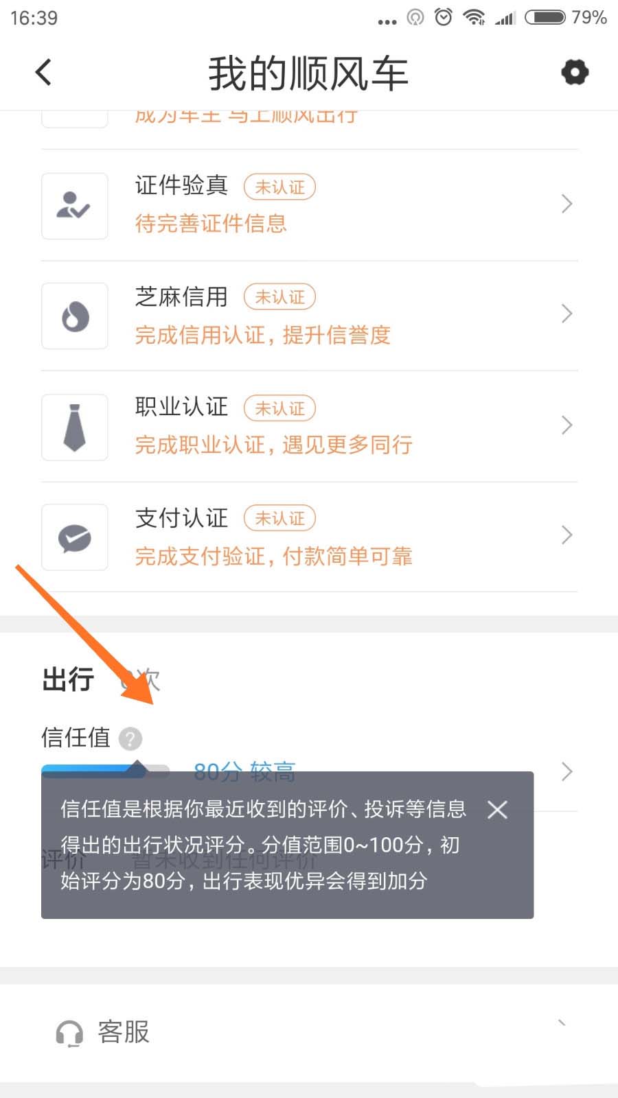 6、如果要查看信誉积分,那么在回到【滴滴出行】主页面,点击一个类似【个人头像】的图标,往下拖动即可看到【信任值】,如下图所示。