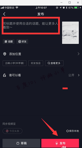 6、输入标题,如果有合适的话题也可以添加一下,最后选择“发布”就行。