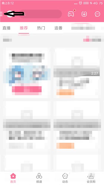1、打开手机B站,在手机B站的首页中点击左上角的个人中心按钮,如图所示。
