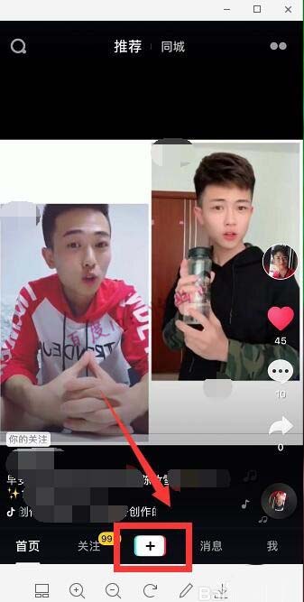 1、打开抖音,在屏幕下方中间有一个加号,我们点击它,如图。