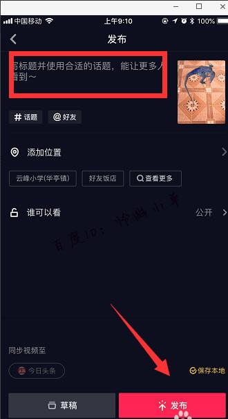 6、写好标题,添加合适的话题,也可以@一下好友,设置查看权限等,然后选择“发布”就可以了。