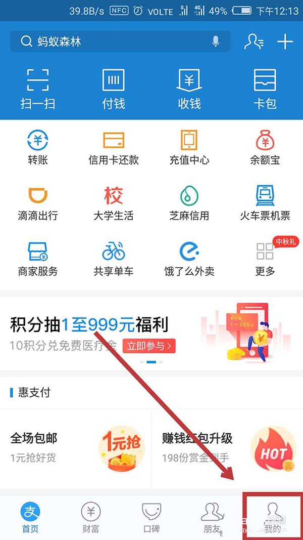1、打开支付宝app后,在界面右下角找到【我的】,点击进入。