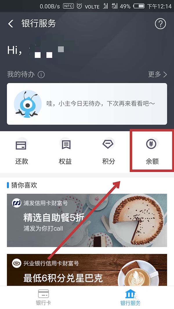 4、然后在界面中部的右侧有一个【余额】,点击进入。
