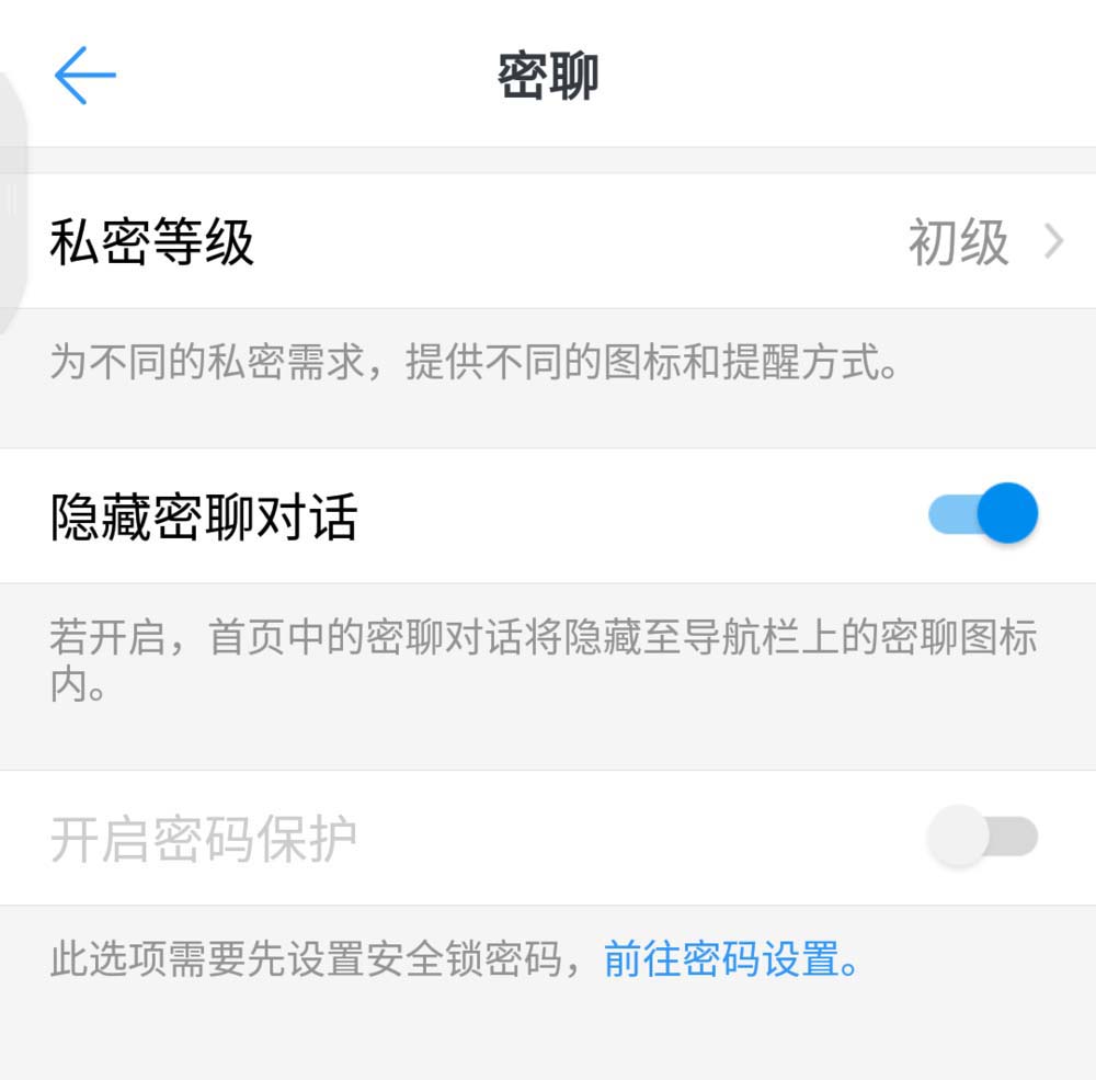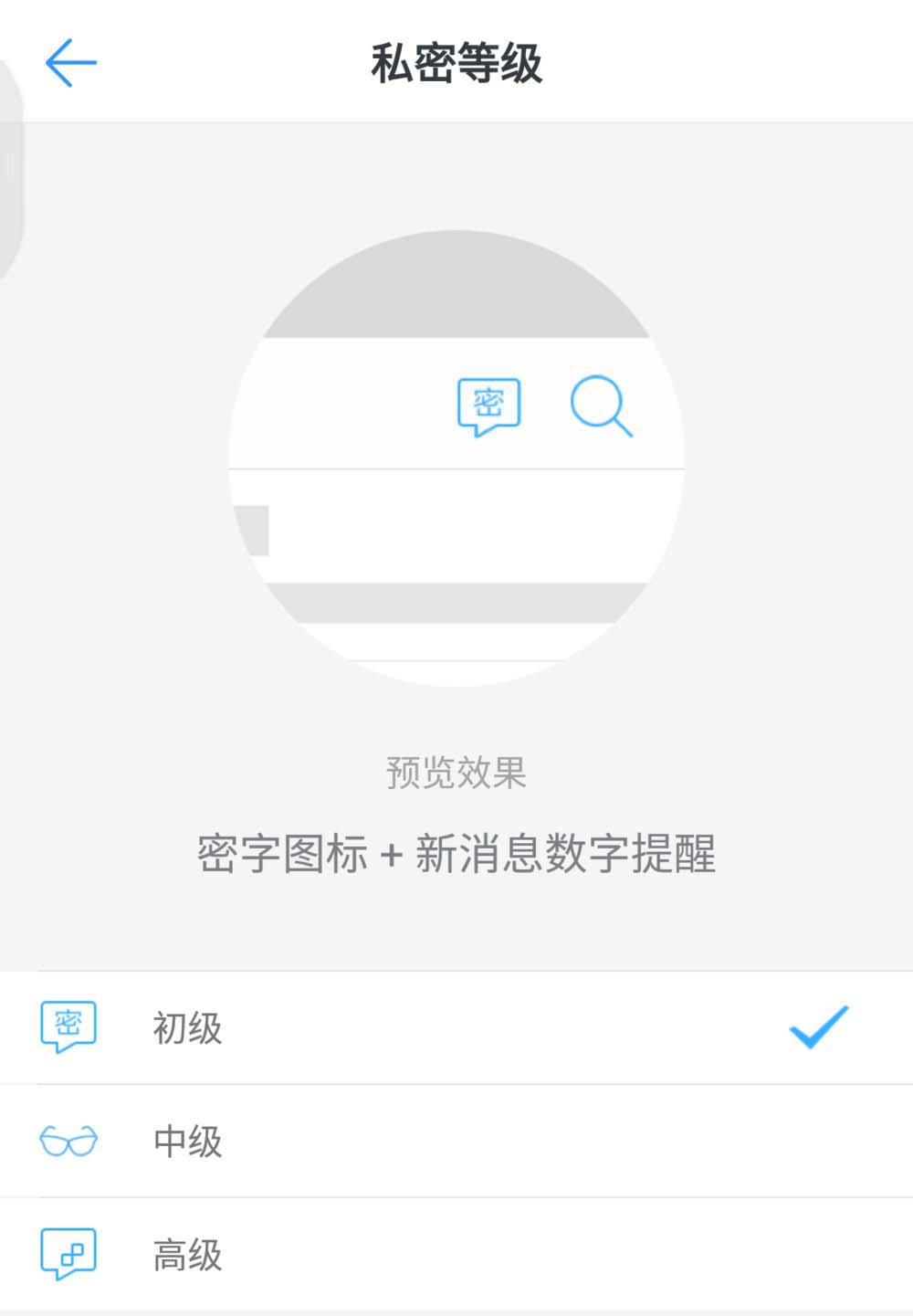 5、密语的等级分为初级设置,中级设置和高级设置三个不同的设置等级,点击就可以自动保存设置,提升聊天安全性。
