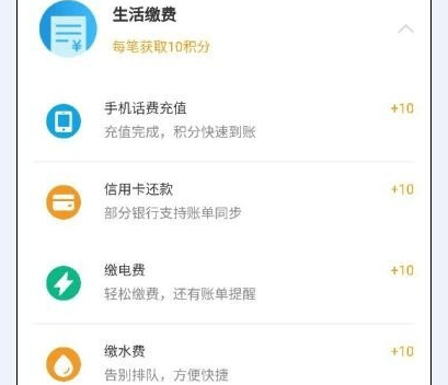 途径2:各种生活缴费,包括话费、水电费、信用卡还款等,每次交费都是奖励10积分,每个类别每月仅限前三次交费能获得积分。