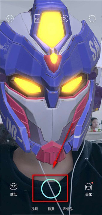 4.点击头盔特效进行拍摄,系统会提醒你只要嘴巴张开,就会自动的生成变形金刚头盔特效。