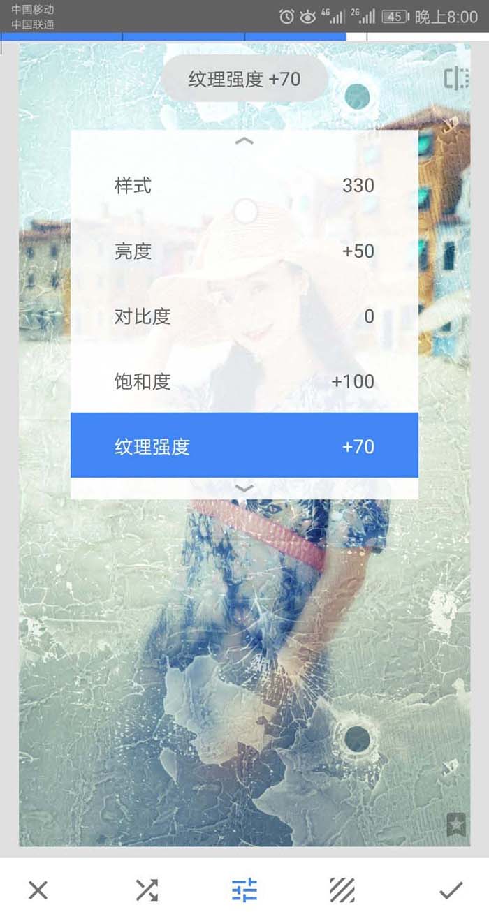 5、接着设置饱和度为100,纹理强度为70,点击右下角的对号确认。