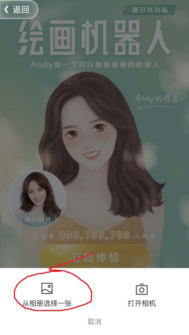 3、选择”绘画机器人“功能,点击”立即体验“,点击”从相册选择一张“或”打开相机“拍摄一张照片。