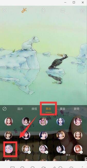 4、向右拉,找到美妆,点击美妆中的蝴蝶妆贴纸,如图。