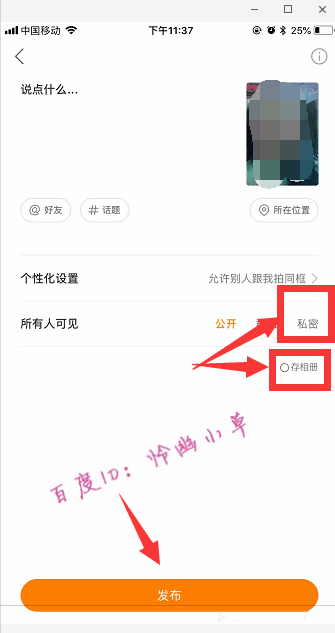 7、如果不想在快手上发布,可以点击“私密”,只有自己可见,勾选存相册,然后点击“发布”,最后将存到相册中的视频传到抖音就可以了。