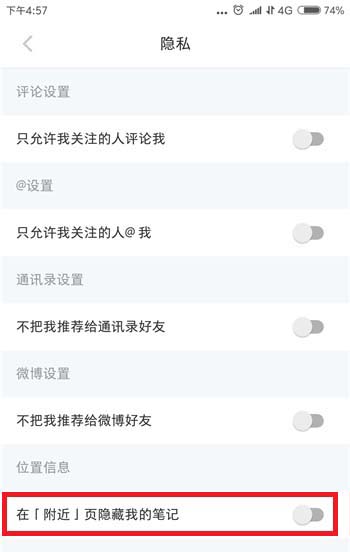 7、接着在隐私界面中找到位置信息下方的【在附近页隐藏我的笔记】并点击,这样就能隐藏我们的笔记了。