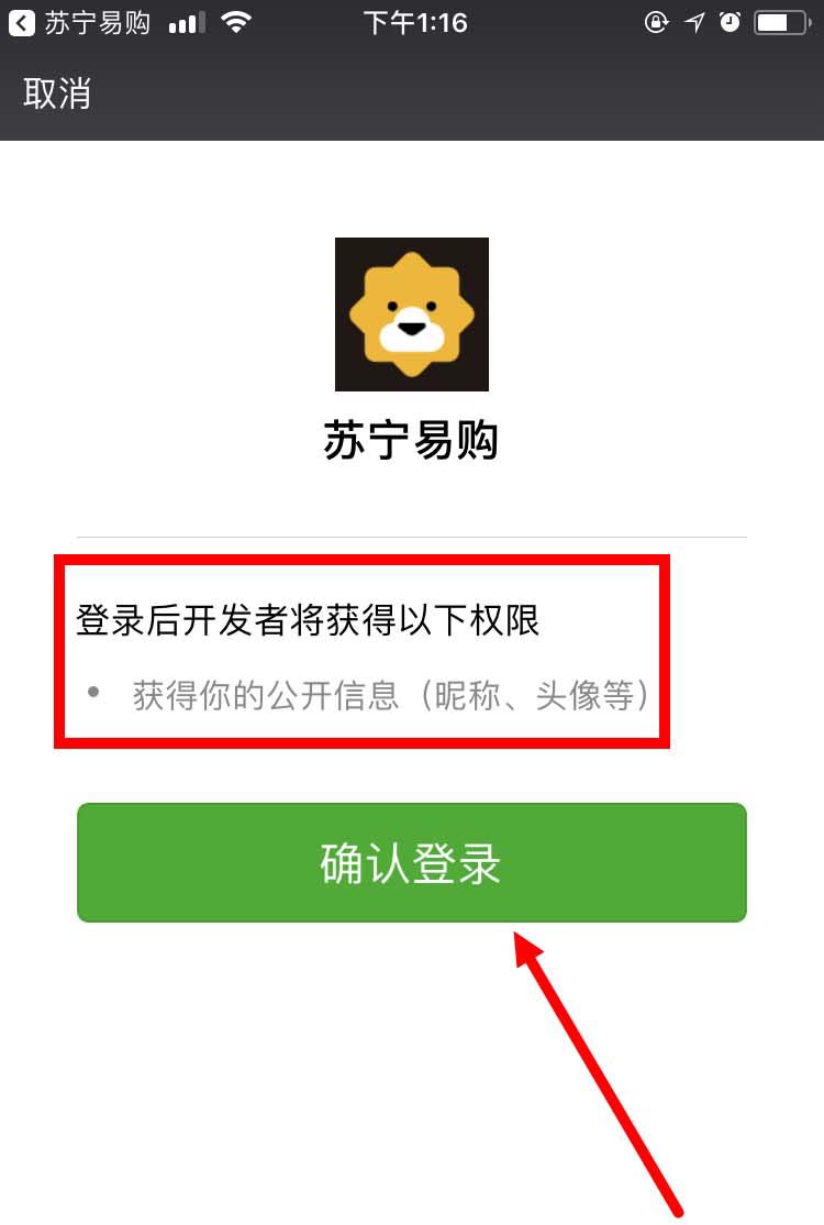5、此时,系统会跳转到微信绑定界面,点击确认登录 。登陆后(关联后),苏宁易购App将会获得一些我们微信的权限:包括昵称、头像等公开信息。