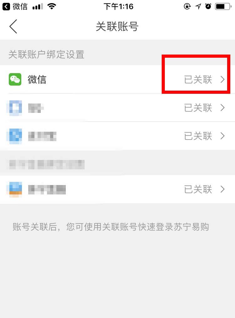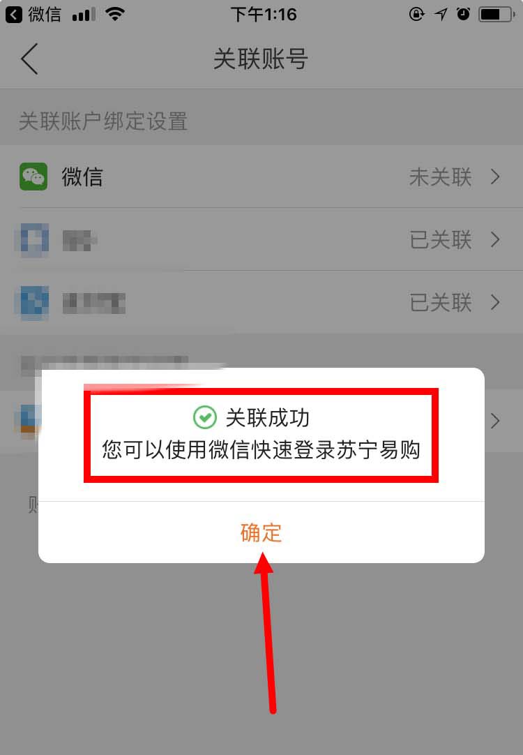 6、OK,关联成功。之后,我们就可以用微信快速登录苏宁易购。