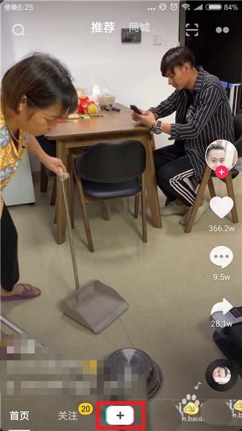2、打开抖音短视频后,在推荐视频播放界面中点击底部的【+】按钮准备录制视频。