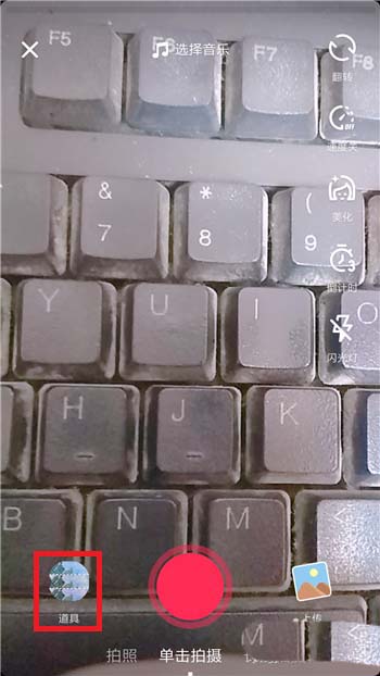3、点击后会打开视频录制界面,这时我们要找到并点击左下角的【道具】选项。