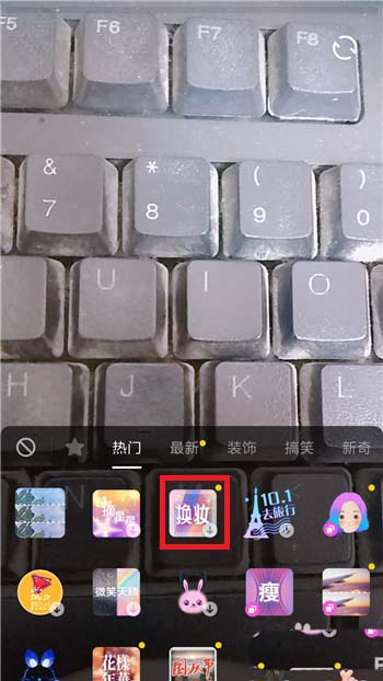4、打开道具界面后找到热门道具下方的【换妆】选项并点击该贴纸使用。