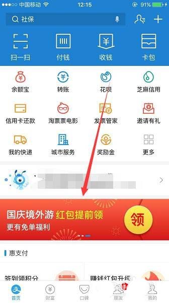 1、打开手机支付宝首页,在首页面中间滚动广告就可以看到国庆境外游红包提前领