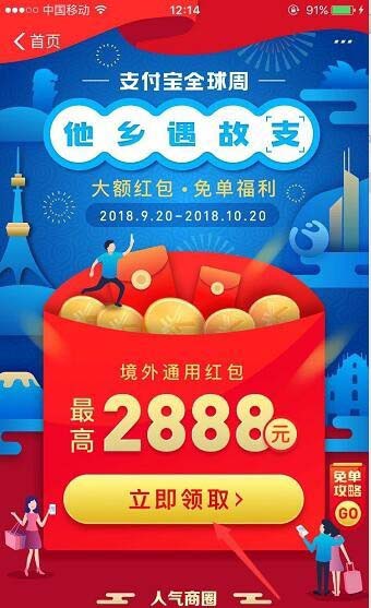 国庆假期期间有很多朋友会选择境外游,在支付宝中可以领取境外支付宝通用红包,有机会赢取免单哦,下面我们就来看看详细的领取方法。