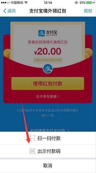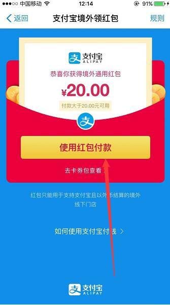 3、恭喜获得境外游红包,购物时候点击使用红包付款