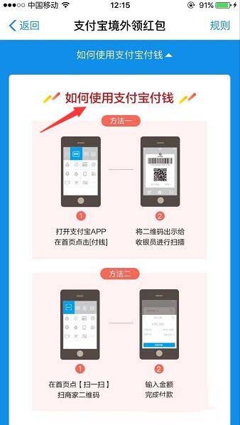 5、在领取红包使用页面,翻到页面下方,有如何使用过支付宝付钱的使用方法