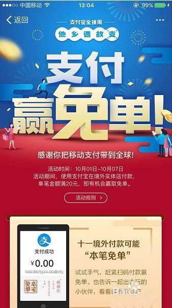 6、境外游他乡遇故知,使用红包支付还有机会获得免单的机会哦。
