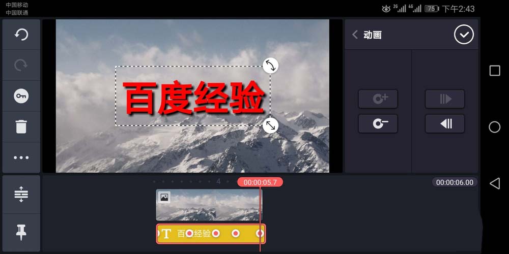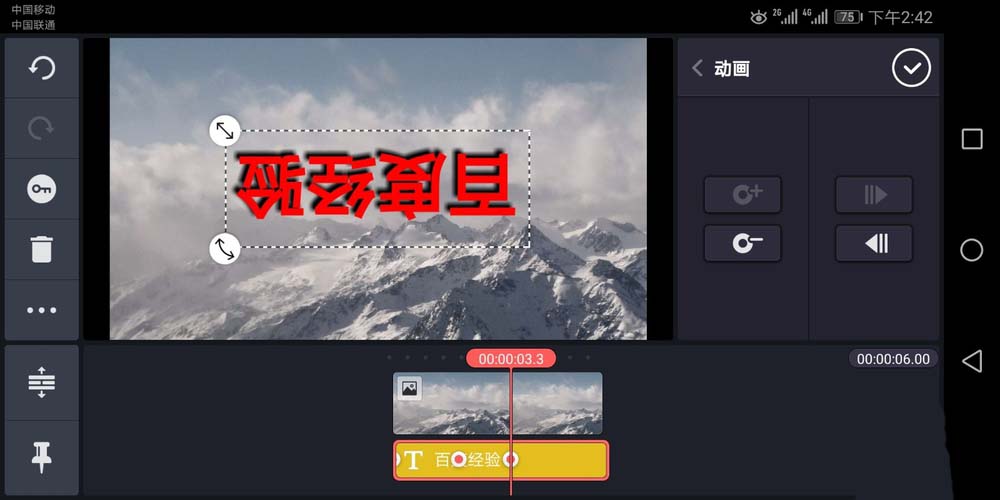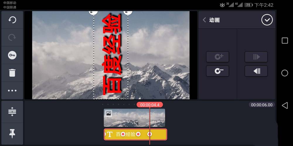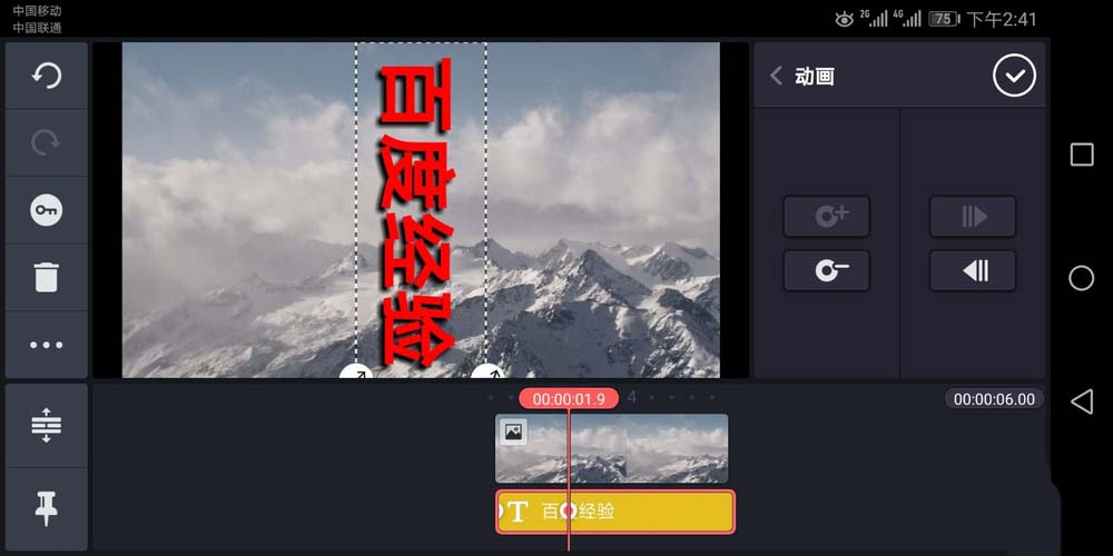 3、选择文字轨道,点击左边的钥匙,移动一段距离,接着调整文字的方向为竖直方向。