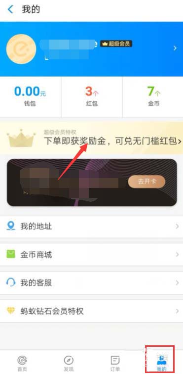 2、此时进入订餐页,点右下方我的,切换到账户管理页,其中页面上方箭头处,为奖励金兑换,点击即可打开会员中心。