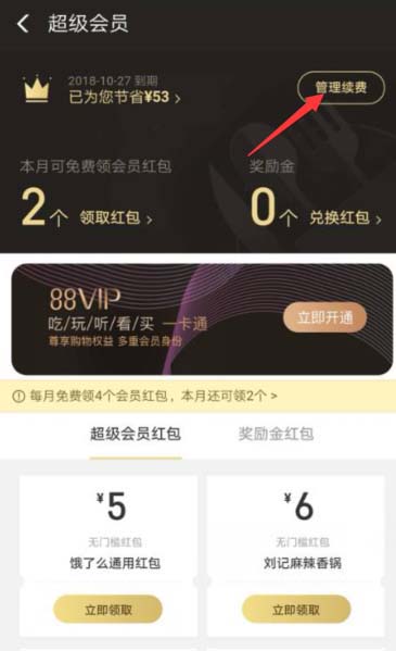 3、进入会员中心,便可看到当月可领无敌红包个数,右上角有管理续费按钮,点击此处,便可进行设置。