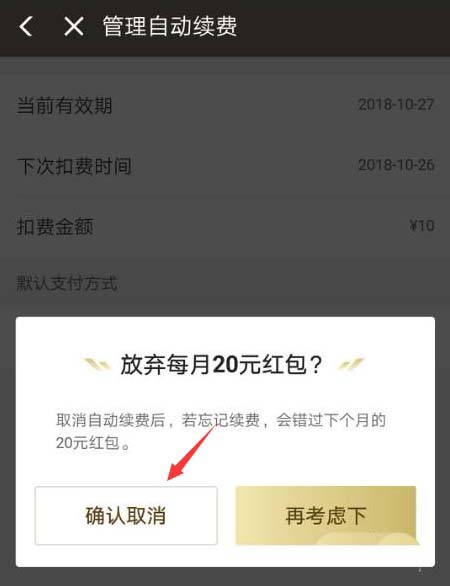 6、最后,会再次进行确认,告知下月将不会享受红包,点击左侧按钮便可继续,完成取消,点击右侧按键,便可终止取消操作。