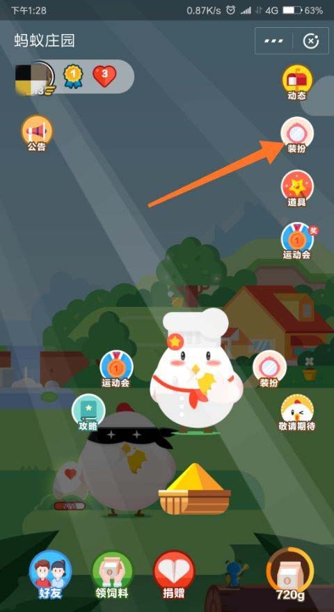 2、进来之后,我们点击自己的小鸡,然后点击“装扮”,如图。当然可以直接点击右上角的装扮。