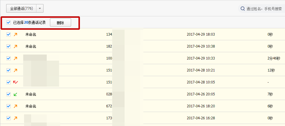 当然,如果你想删除通话记录,可以在姓名旁边的方框中打勾、选择删除即可。
