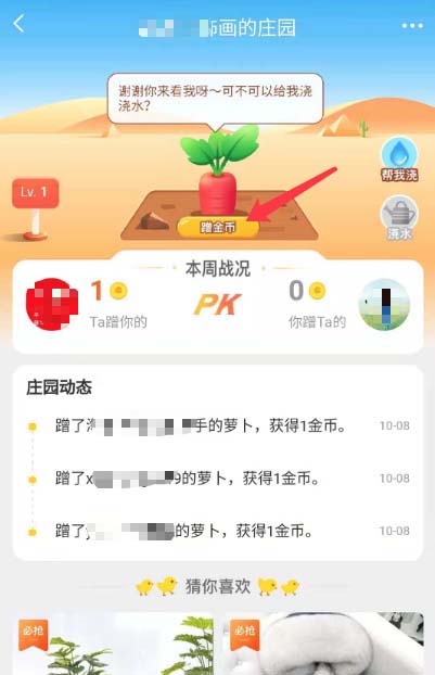 7、如何给好友浇水呢?我们可以选择另一位好友的淘金币庄园进入,点击【浇水】