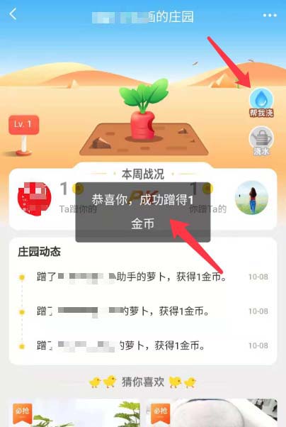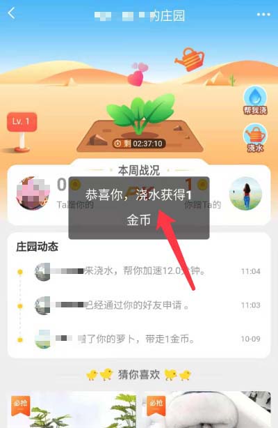 8、点击后,界面也会提示“恭喜你,浇水获得金币”,表示已成功帮忙浇水哦
