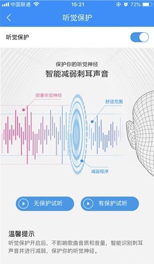 最后提醒还在犹豫开不开启听觉保护的伙伴们,点击下方的【无保护试听】和【有保护试听】即可轻松对比开启与不开启的效果,不用开启后返回首页测试试听噢。