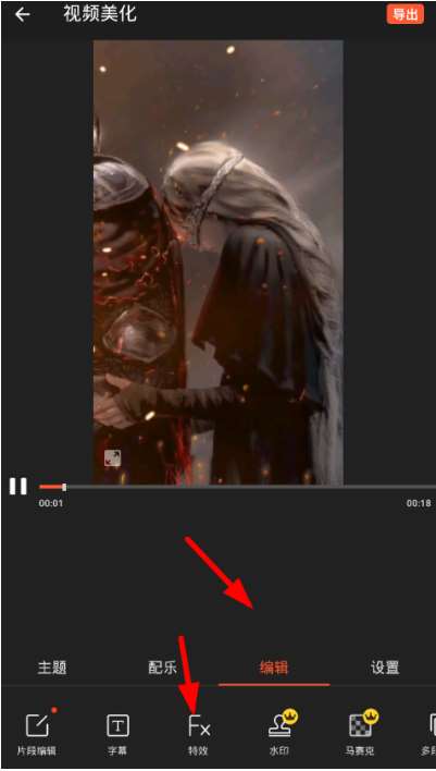 打开视频,进入美化页面,点击底端的“编辑”选项,找到“特效”功能。