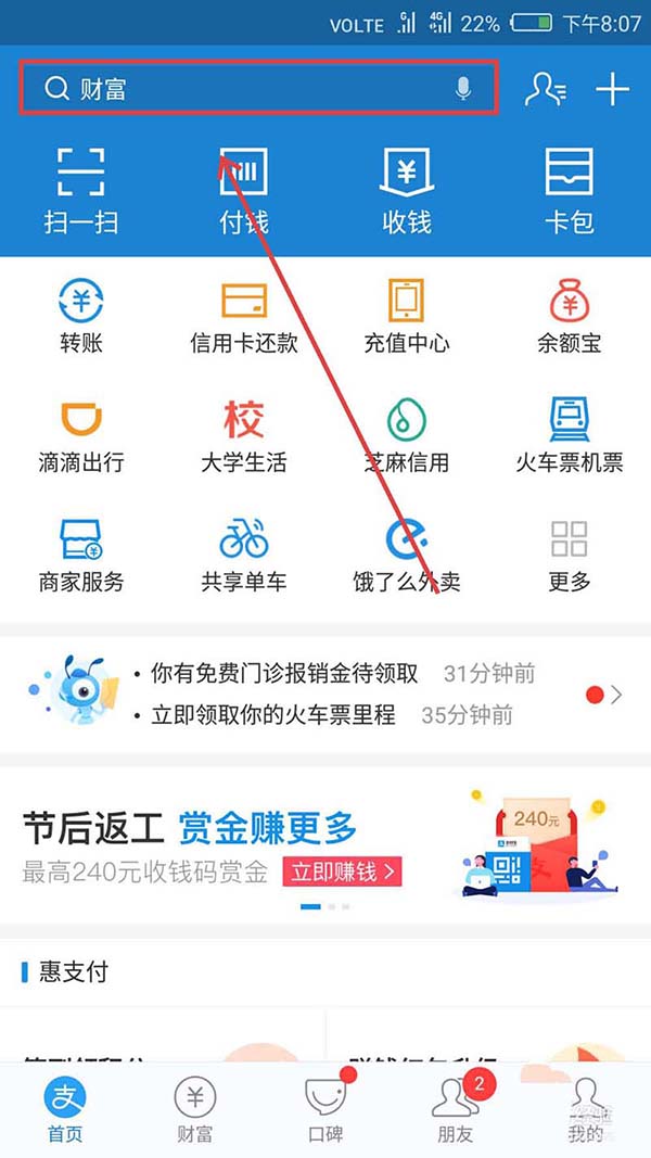 5、我们也可以直接在上方搜索框里搜索【花呗权益】,点击界面上方的搜索框。