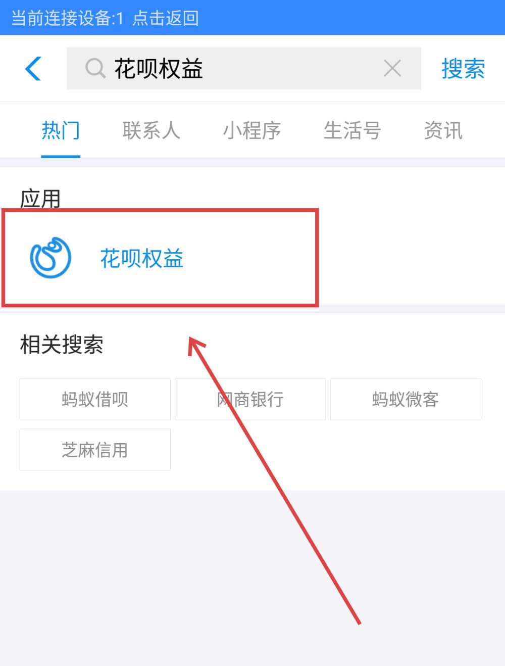 6、然后输入【花呗权益】,点击下册的应用【花呗权益】就可以了。