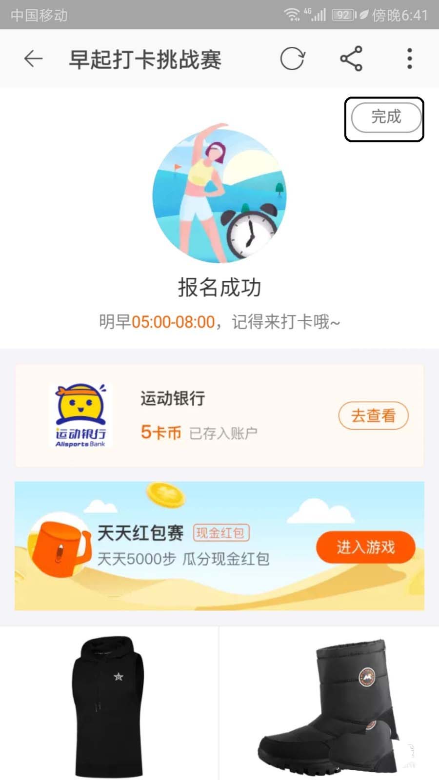 7、等到凌晨5点到8点时间内进入淘宝这活动点击打卡可出现如图所示。如果继续报名明日早起点击该按钮切换到交保证金界面。